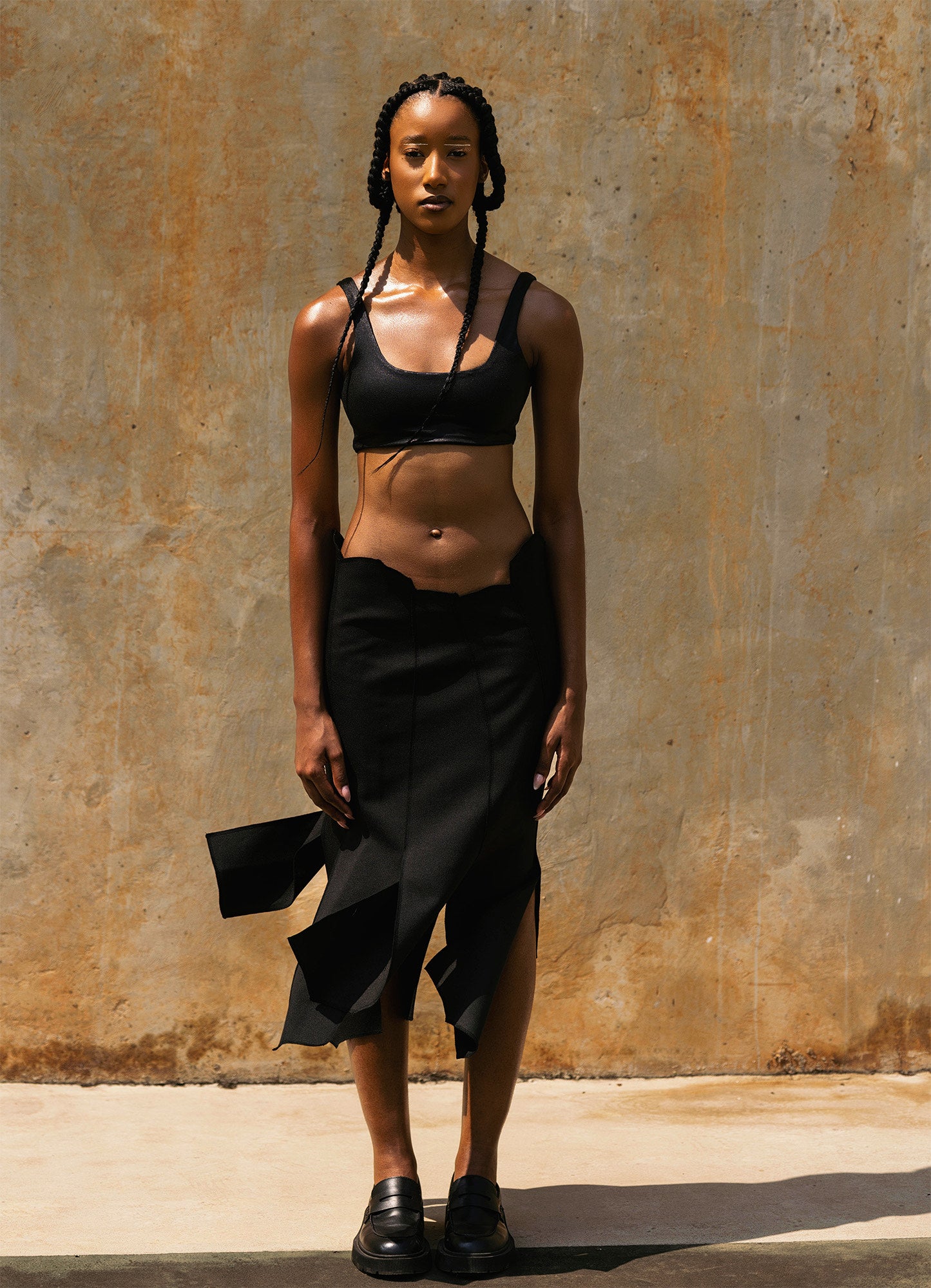 O mundo em movimento. A saia desconstruída é chão e liberdade, sombra e revelação. É onde a raiz se torna caminho - firme, indomável e bela.